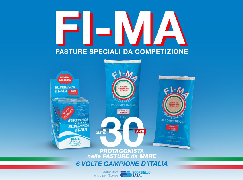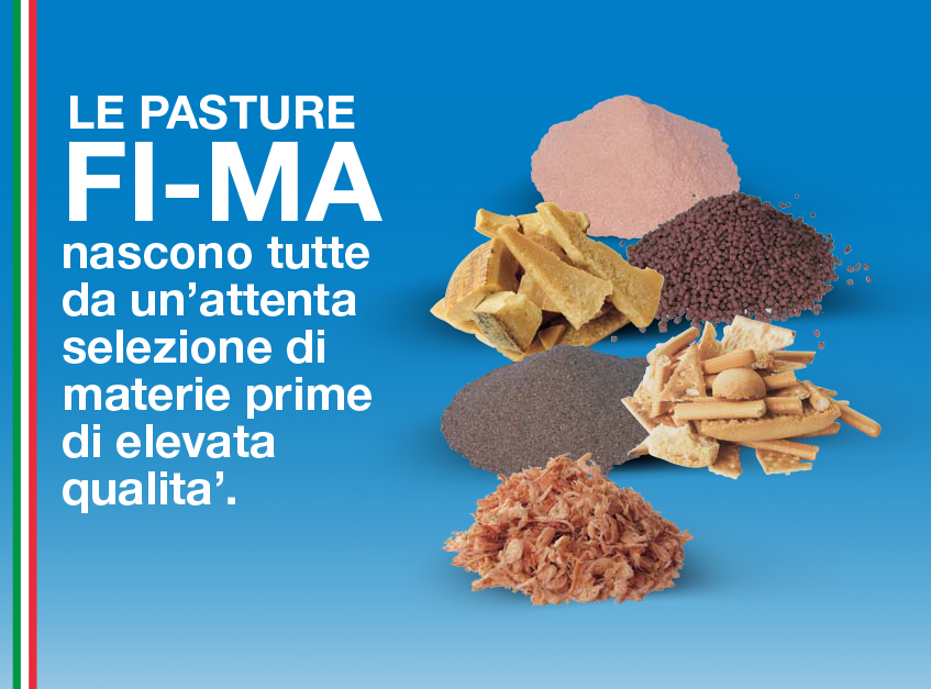L’ESPERIENZA DELLE COMPETIZIONI: Inizialmente formulate ed utilizzate in gara dall’omonima squadra, che per oltre 10 anni ha monopolizzato i vertici dell’agonismo nazionale, vincendo ben 6 Campionati Italiani. L’INNOVATIVO CONCETTO FORMULATIVO: ELIMINAZIONE DELLE SOSTANZE RIEMPITIVE INUTILI In una pastura commerciale i principi attivi, cioè le sostanze che hanno potere attirante nei confronti dei pesci, sono spesso meno del 50%. Nelle pasture FI-MA tutti gli ingredienti sono combinati fra loro non per fare “peso”, ma per ottenere sinergicamente il miglior potere attirante possibile. Per questa ragione, possono essere impiegate in quantità inferiore rispetto ai normali prodotti commerciali, perché SUPER CONCENTRATE. LA SELEZIONE DI MATERIE PRIME DI ELEVATA QUALITA’ Tutti i materiali utilizzati nelle pasture FI-MA sono di prima qualità e di origine naturale. Anche gli stimolatori di appetito, inseriti sotto forma di aminoacidi, peptidi ed esteri di acidi grassi insaturi, hanno tutti derivazione naturale. IL CONFEZIONAMENTO I sacchetti nei quali le pasture FI-MA sono confezionate sono realizzati in film triplo strato, che crea un effetto barriera alla penetrazione delle molecole di ossigeno, preservando il contenuto da fenomeni di invecchiamento precoce.